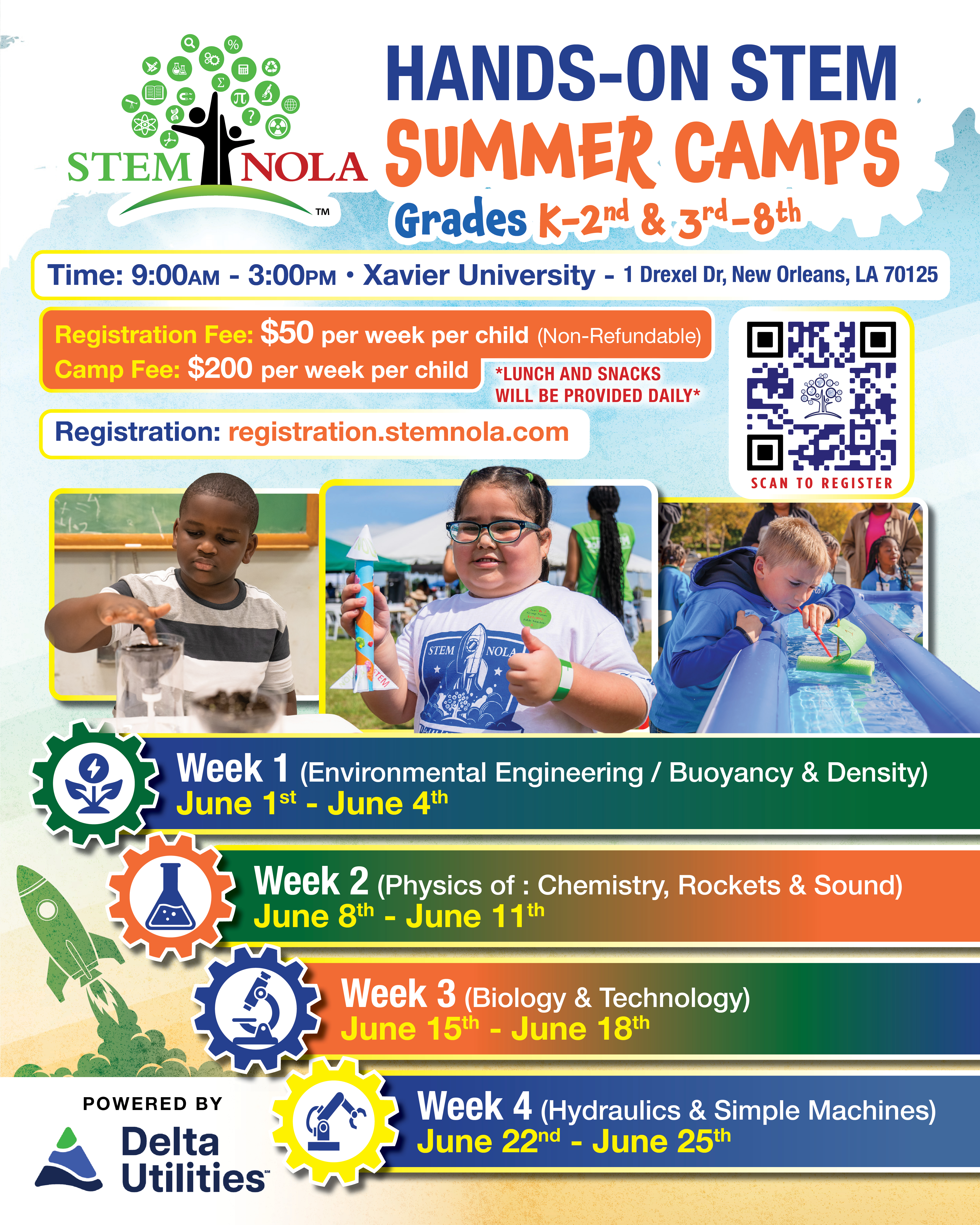 STEM NOLA’s Hands-On STEM Summer Camps powered by Chevron are back—bringing exciting, interactive learning experiences to students in grades K–8 at Xavier University of Louisiana!