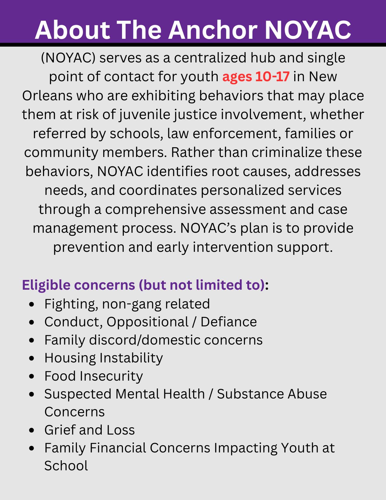 That’s why we’d like to share a free community resource with you: The Anchor New Orleans Youth Assessment Center (NOYAC), located at The Family Center of Hope – Washington Campus.